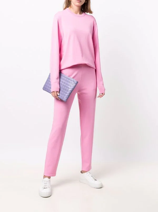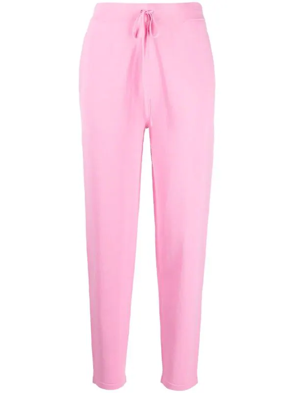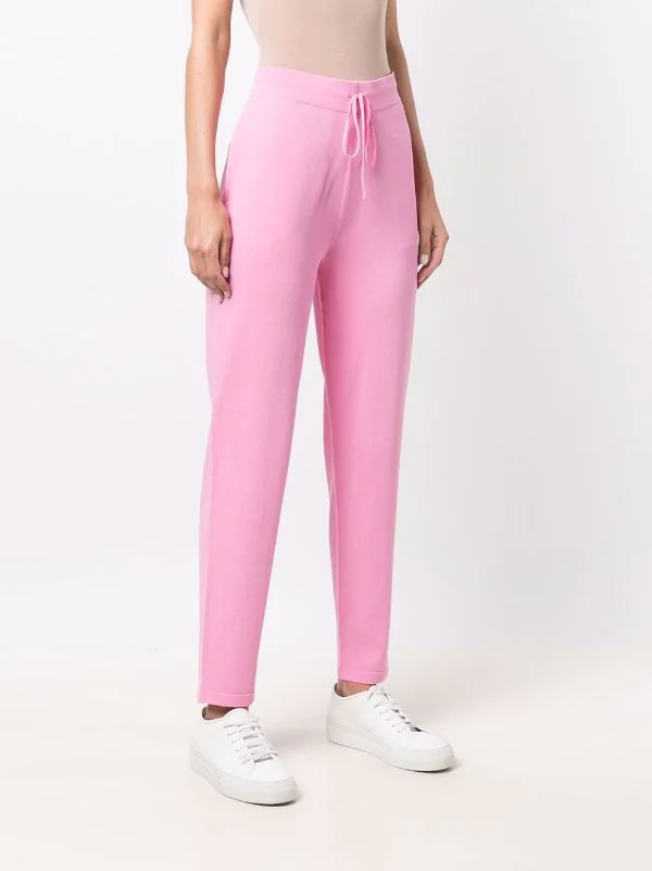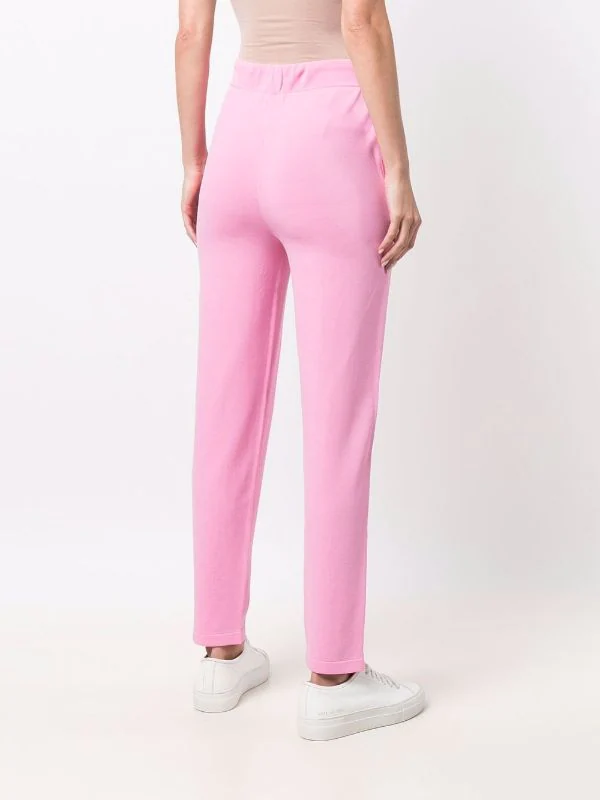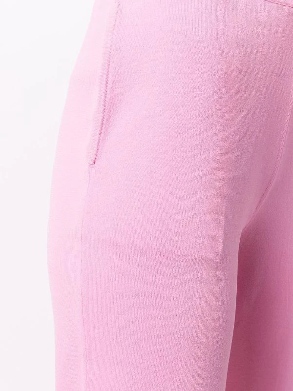 Tricot point jersey, fini texturé, taille élastique à lien de resserrage, poches latérales fendues, coupe fuselée. Couleur : rose.