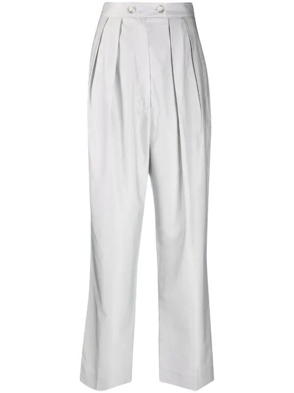 Détails de plis, taille haute, fermeture décalée sur le devant, deux poches passepoilées avant. Couleur : gris.