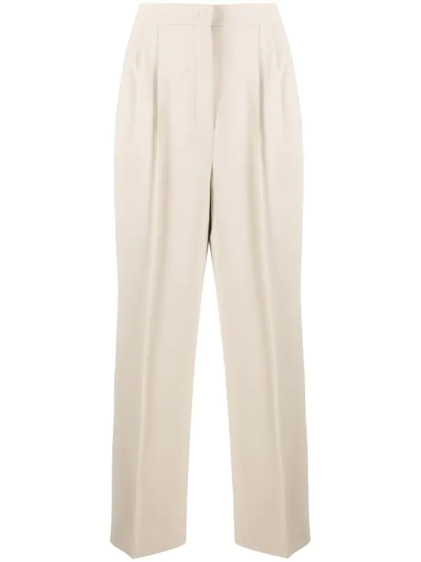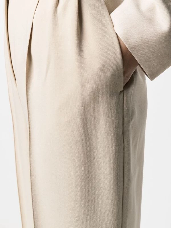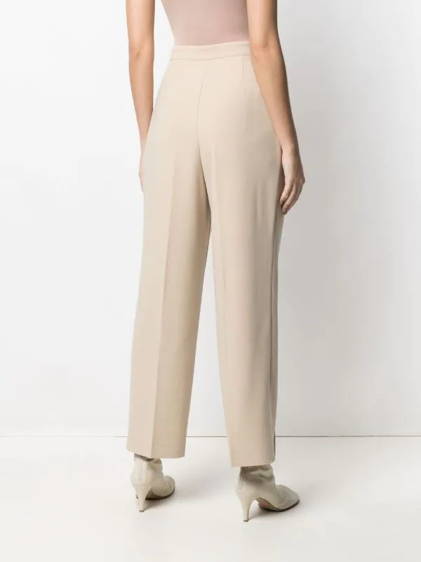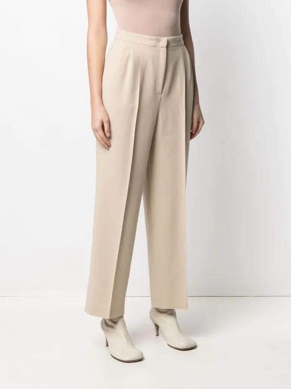 Tissu flammé, plis marqués, plis creux, taille haute, fermeture à zip et agrafes, poches latérales fendues.