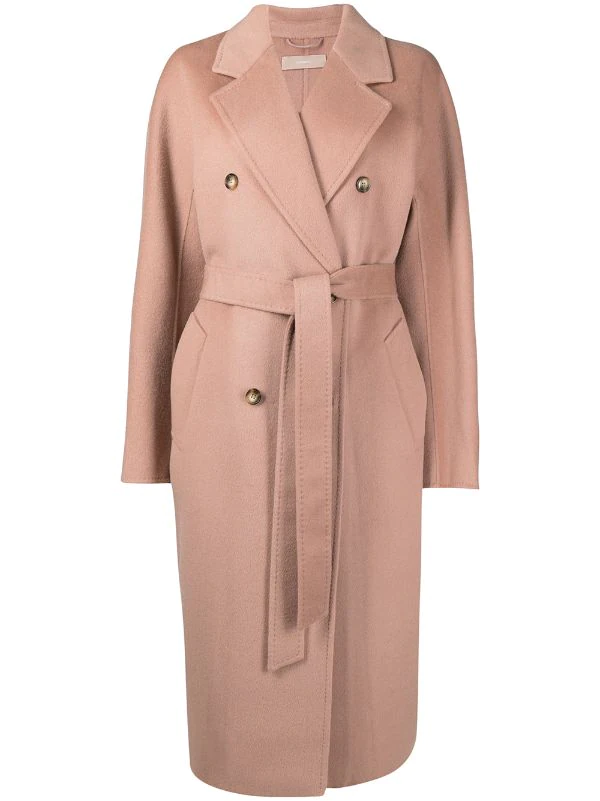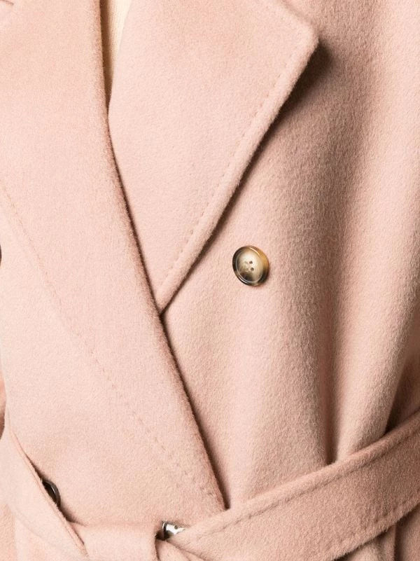 Col cranté, taille ceinturée, boutonnière croisée, manches longues, ourlet droit. Matière : laine.