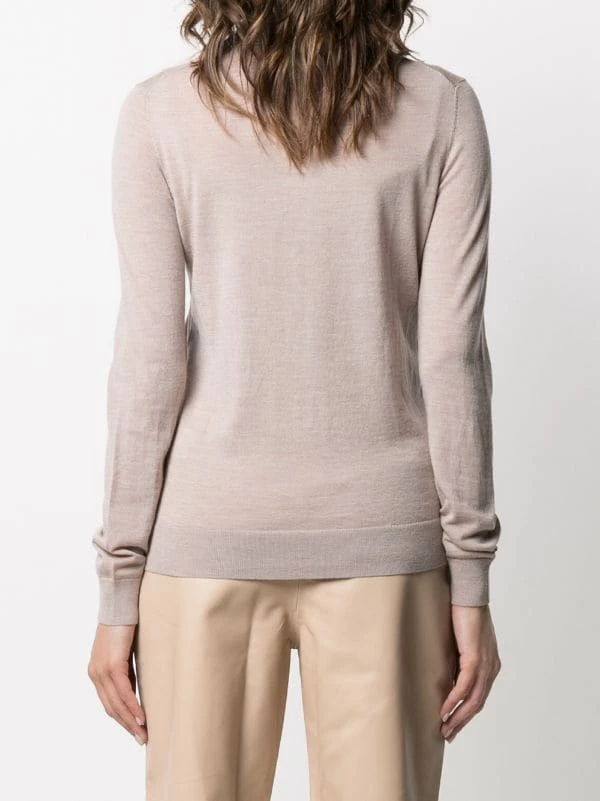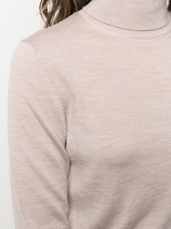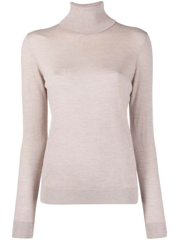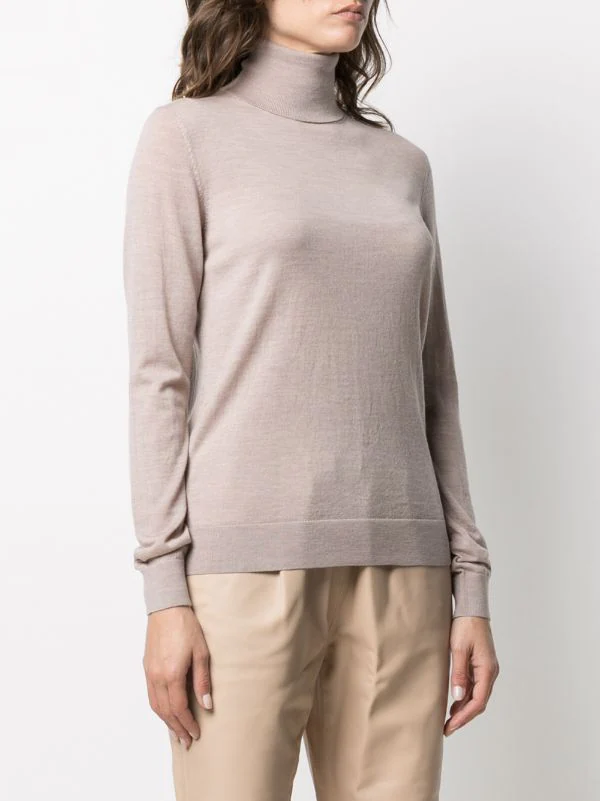 Ourlet nervuré, poignets nervurés, col roulé, manches longues, ourlet droit. Matière : mérinos.