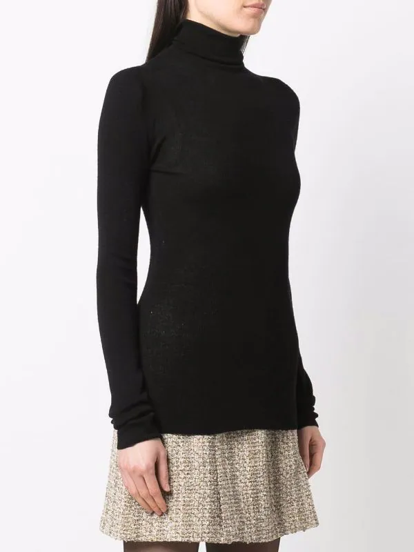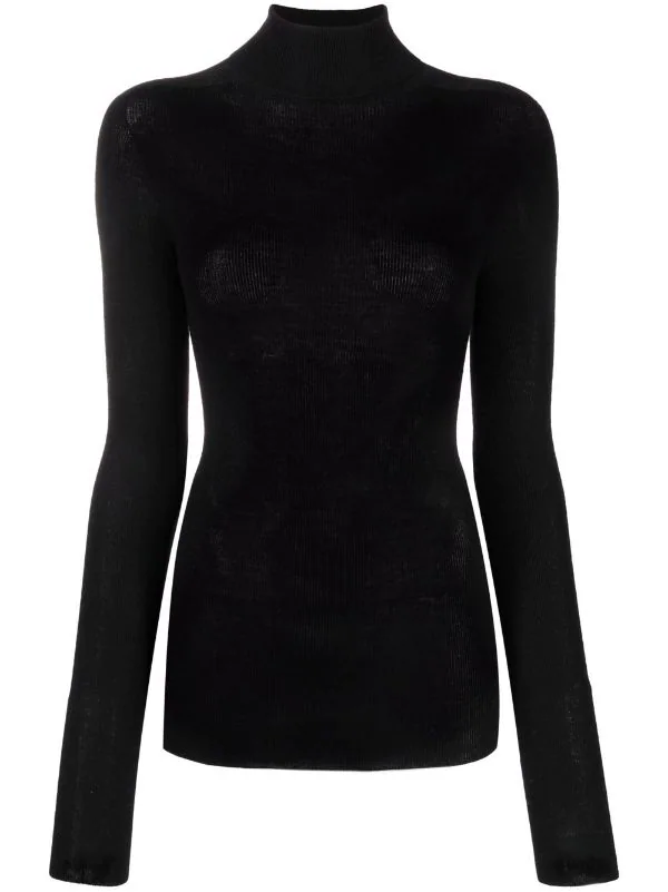 Effet de transparence, fines nervures, col roulé, manches longues. Couleur : noir. Matière : laine mérinos.