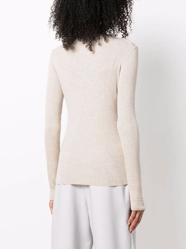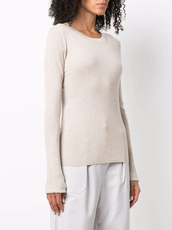 Maille nervurée, encolure ronde, manches longues, ourlet retroussé, ourlet droit. Matière : laine mérinos.