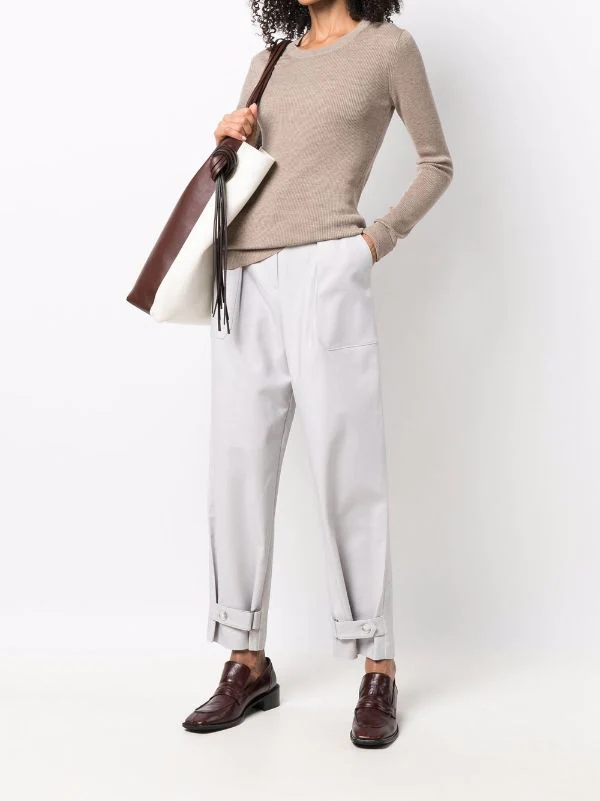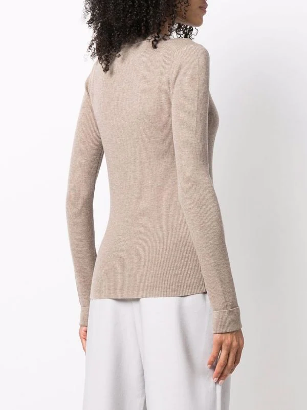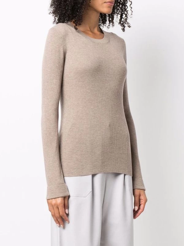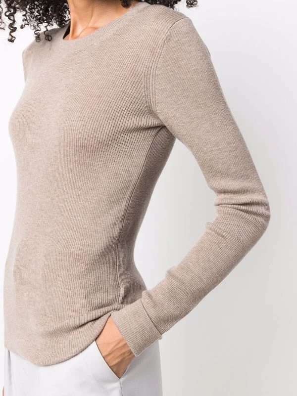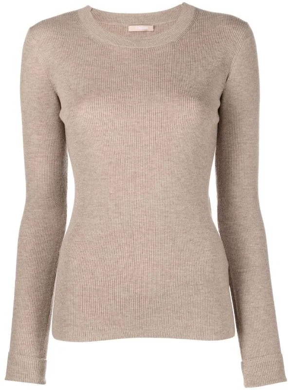 Maille nervurée, encolure ronde, manches longues, ourlet retroussé, ourlet droit. Matière : laine mérinos.