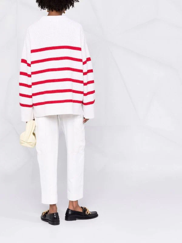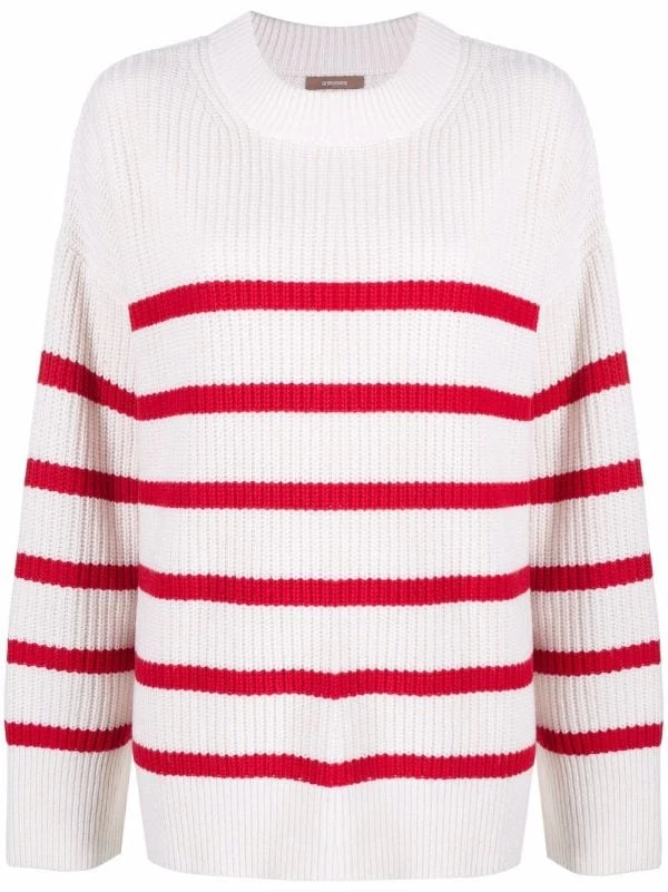 Modèle bicolore, rayures horizontales, maille nervurée, encolure ras du cou, manches longues, ourlet droit.