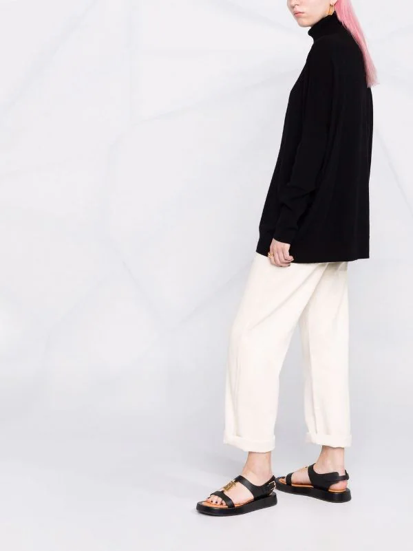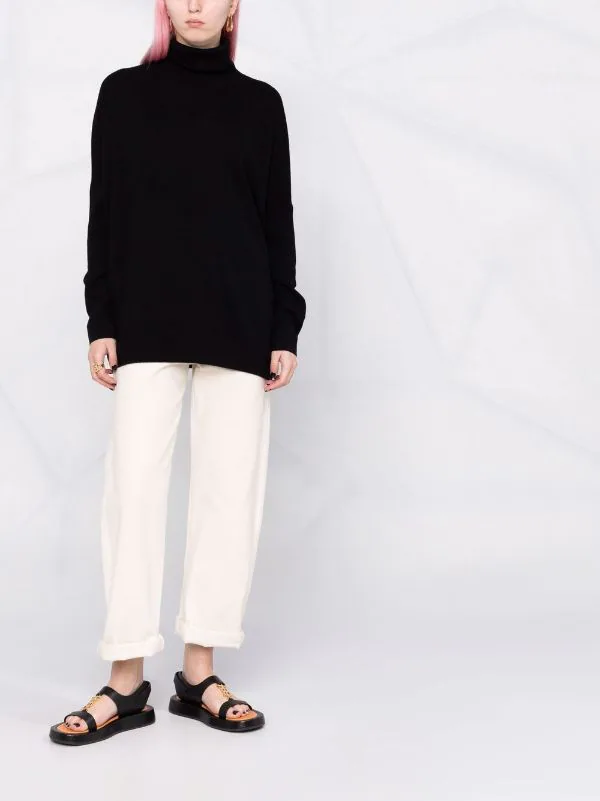 Col roulé, épaules tombantes, manches longues, finitions nervurées. Couleur : noir.