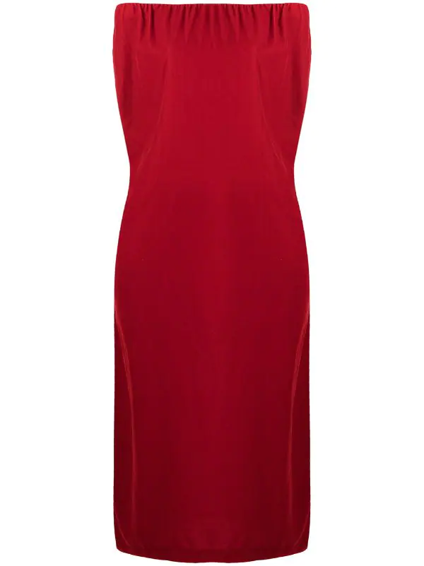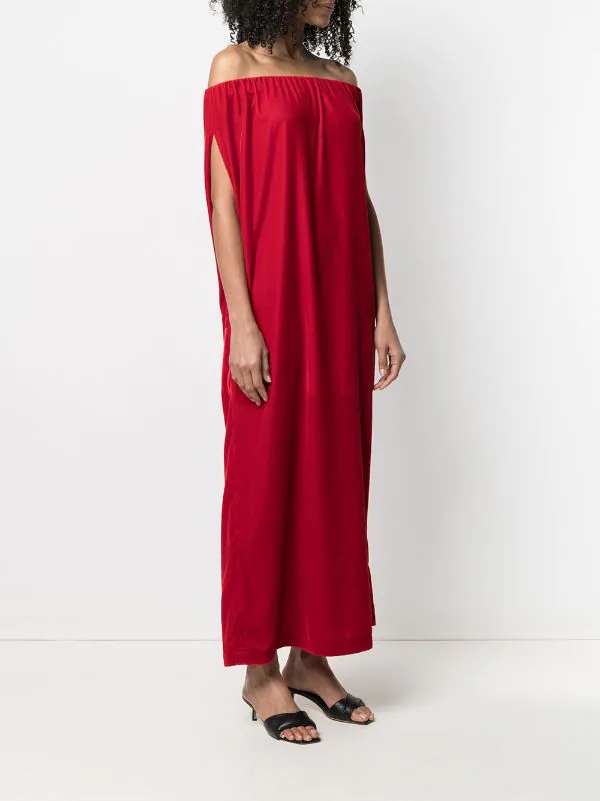 Épaules dénudées, manches courtes, coupe longue. Couleur : rouge.