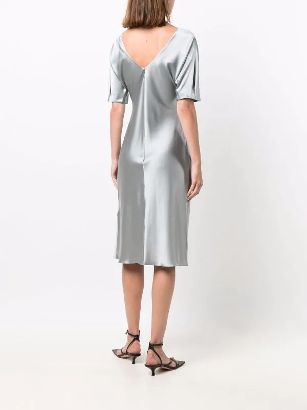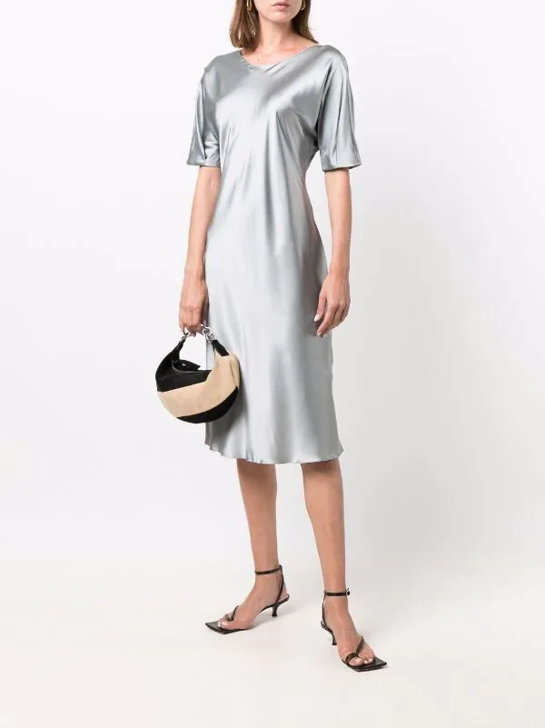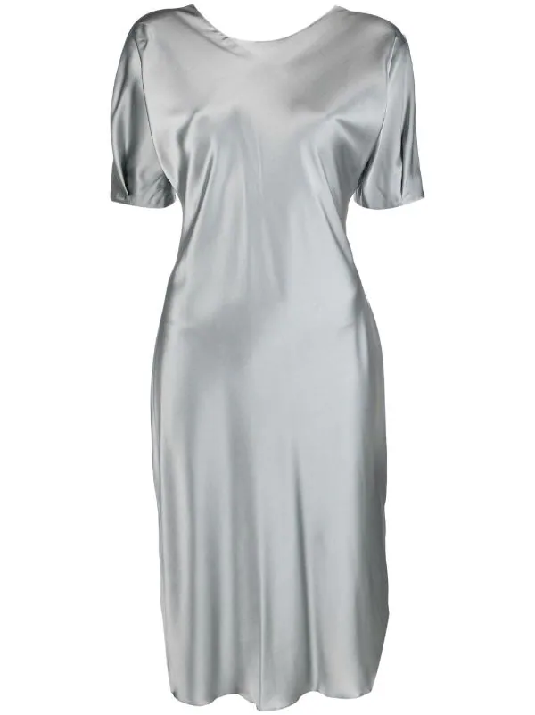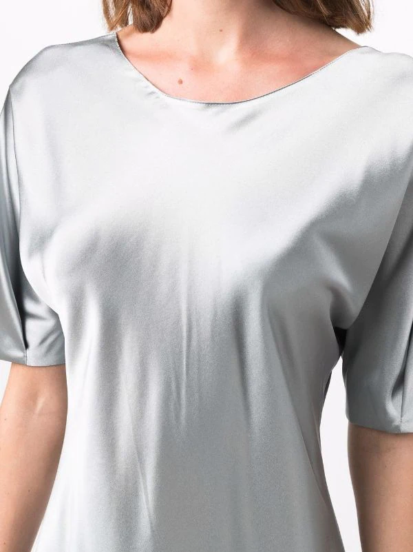 Fini satiné, col v au dos, encolure ronde, manches courtes, coupe mi-longue. Couleur : gris. Matière : soie.