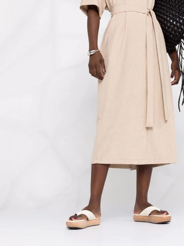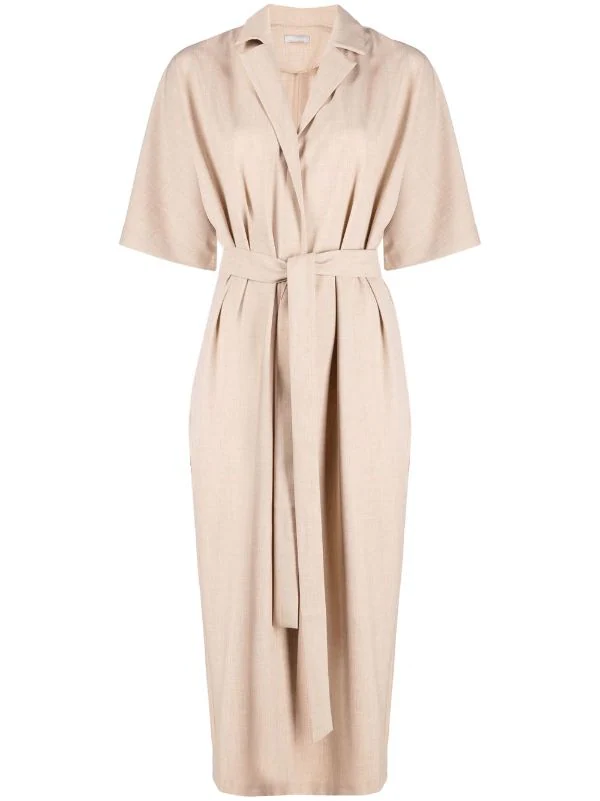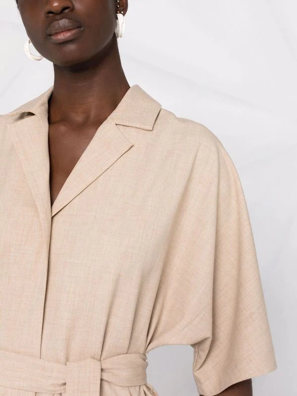 Design portefeuille, taille nouée, col cubain, manches courtes, coupe mi-longue.