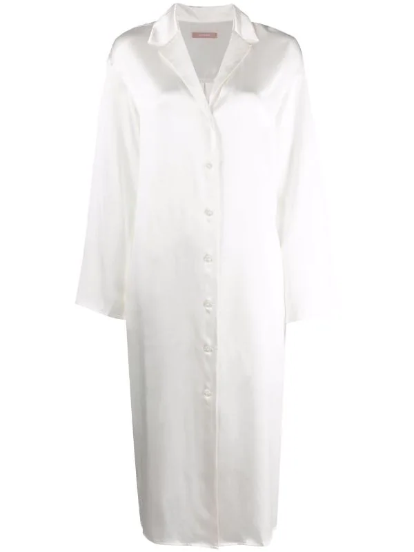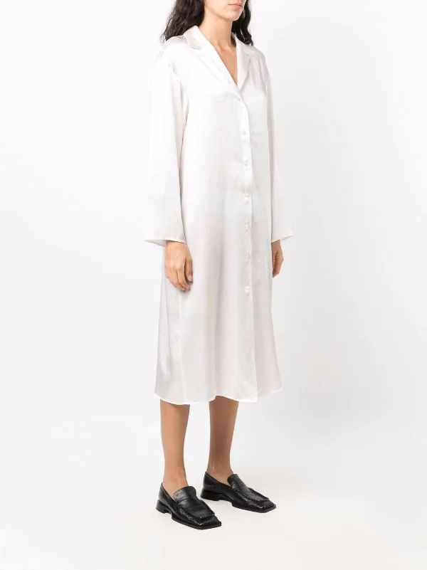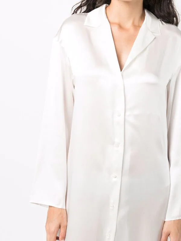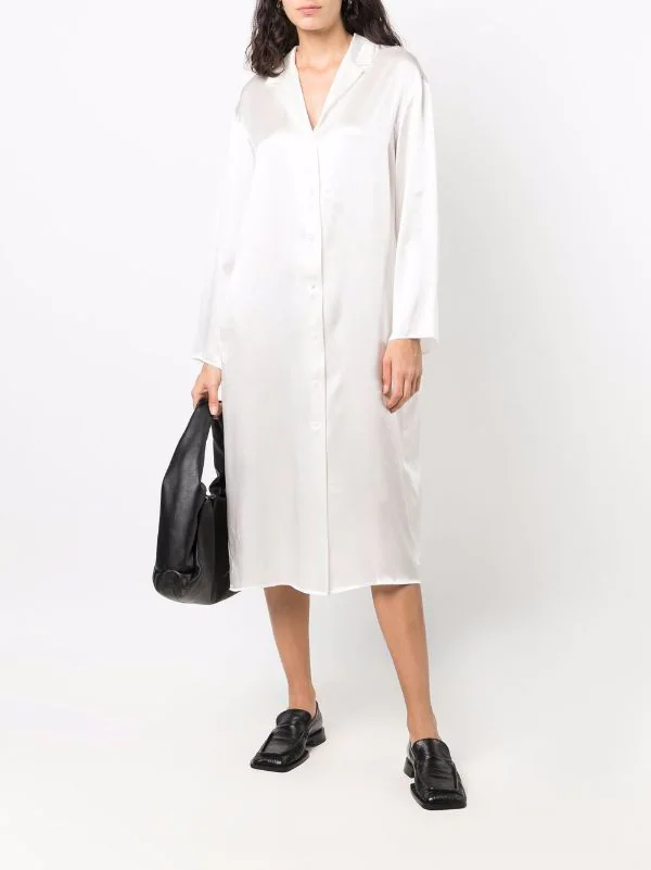 Fini satiné, col cranté, boutonnière sur le devant, manches longues, ourlet incurvé, coupe mi-longue. Matière : soie.