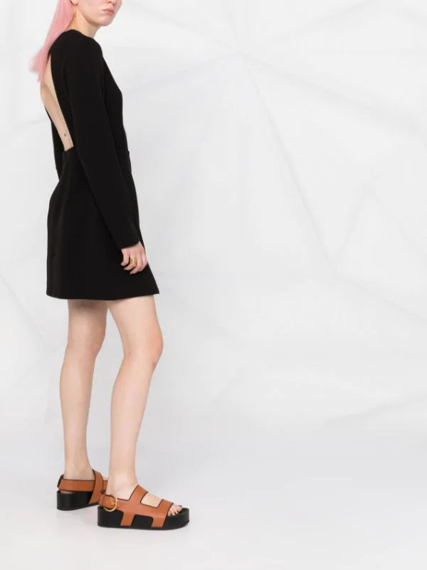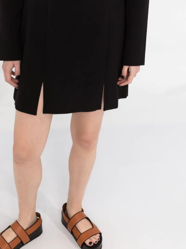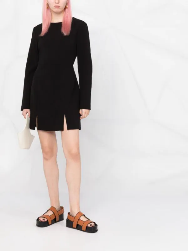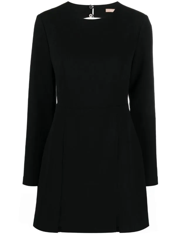 Encolure ronde, bouton et zip à l’arrière, encolure carrée au dos, manches longues, jupe évasée, fentes latérales, ourlet droit. Couleur : noir.