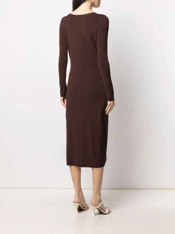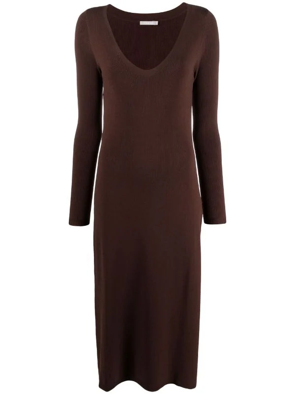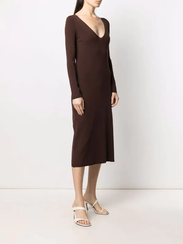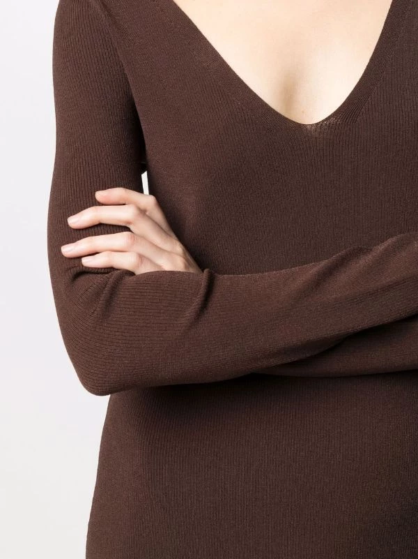 Maille fine, col v, manches longues, coupe mi-longue. Couleur : marron.
