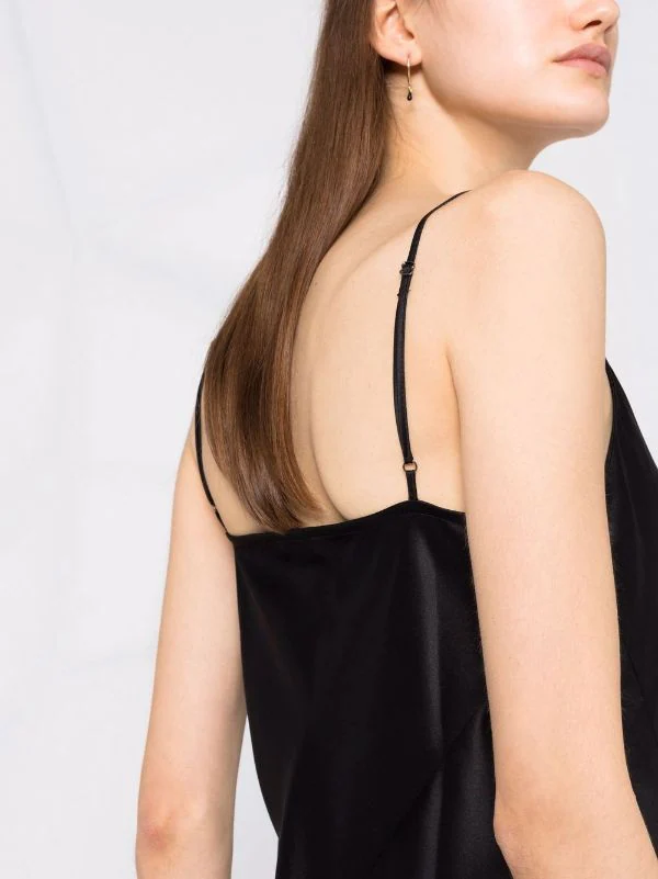 Brides porté épaule ajustables, col v, ourlet droit. Couleur : noir. Matière : soie.