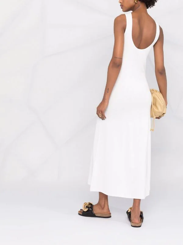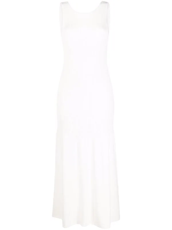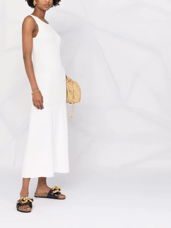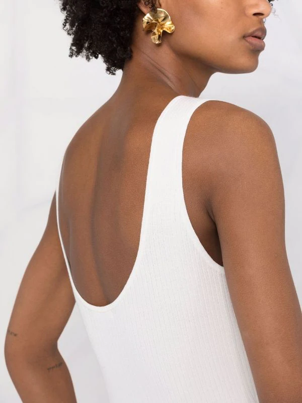 Maille nervurée, encolure ronde, coupe longue, design sans manches. Couleur : blanc.