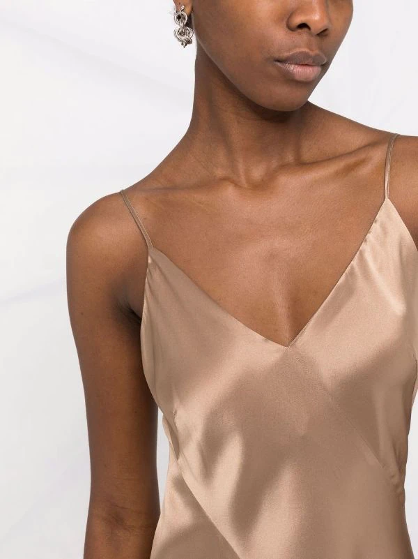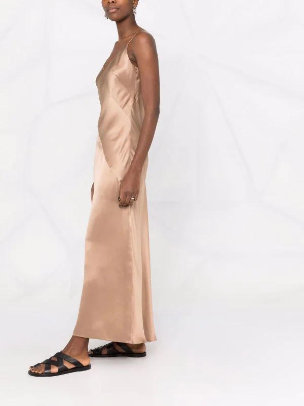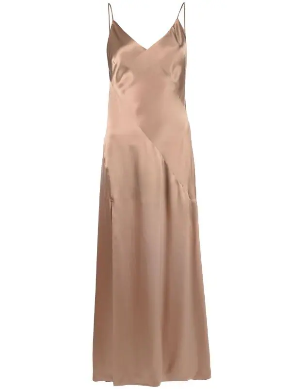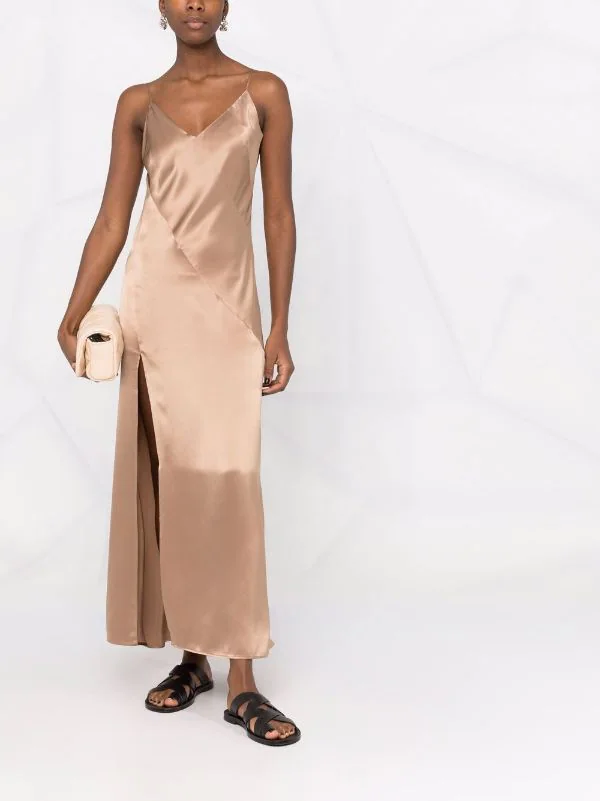 Fines bretelles, col v, détails de coutures apparentes, fente latérale, forme nuisette, hauteur cheville. Matière : soie.