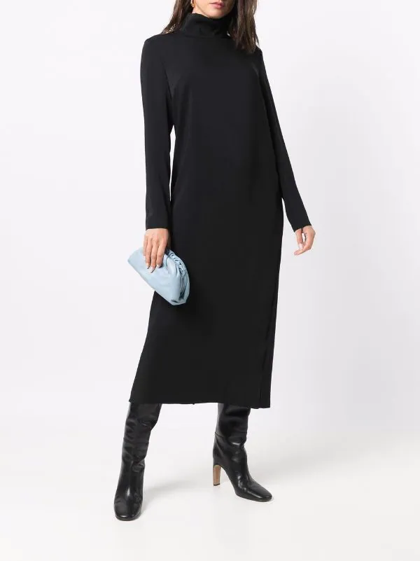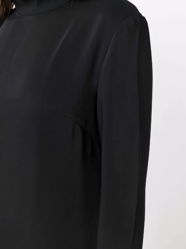 Col cheminée, fermeture arrière dissimulée, manches longues, fente à l’arrière, ourlet droit. Couleur : noir.