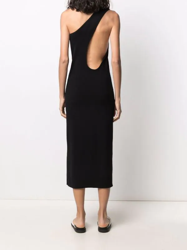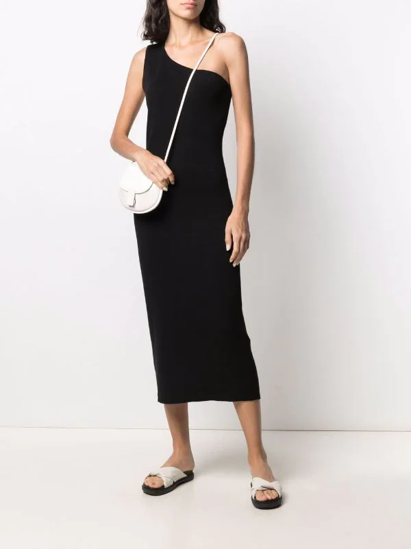 Détail nervuré, talon ouvert, design asymétrique à une épaule, longueur au dessous du genou. Couleur : noir.