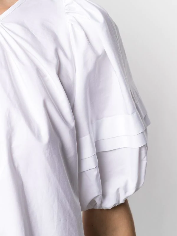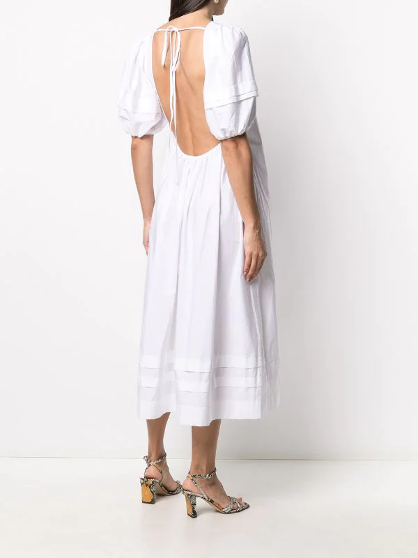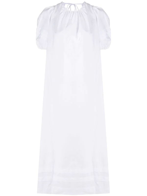 Encolure ronde, fermeture nouée au dos, dos-nu, manches courtes, coupe mi-longue. Couleur : blanc. Matière : coton.