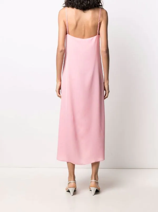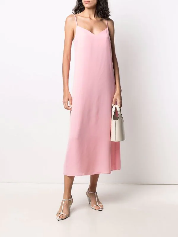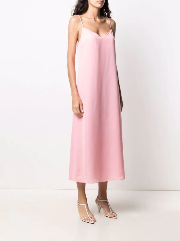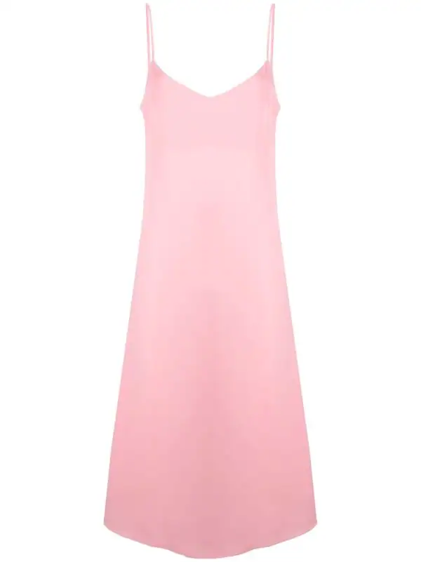 Fini mat, coutures ton sur ton, col v, bretelles fines ajustables, jupe évasée. Couleur : rose.