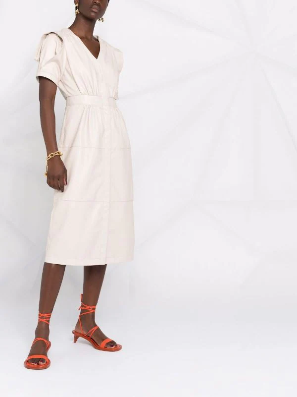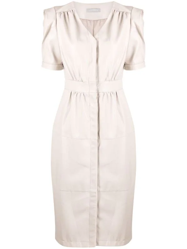 Détails de fronces, col v, manches courtes, coupe mi-longue.