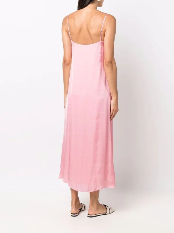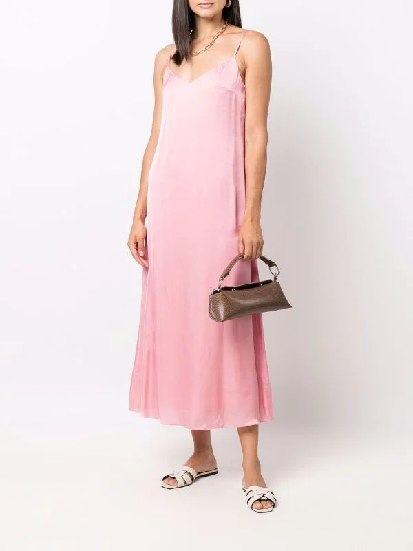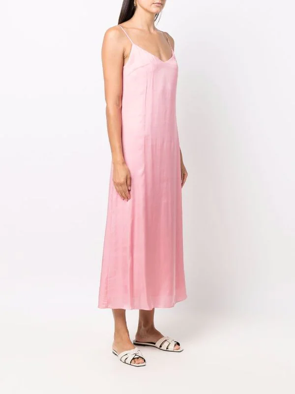 Rose, col v, bretelles fines, design sans manches, coupe évasée, coupe longue, ourlet droit.