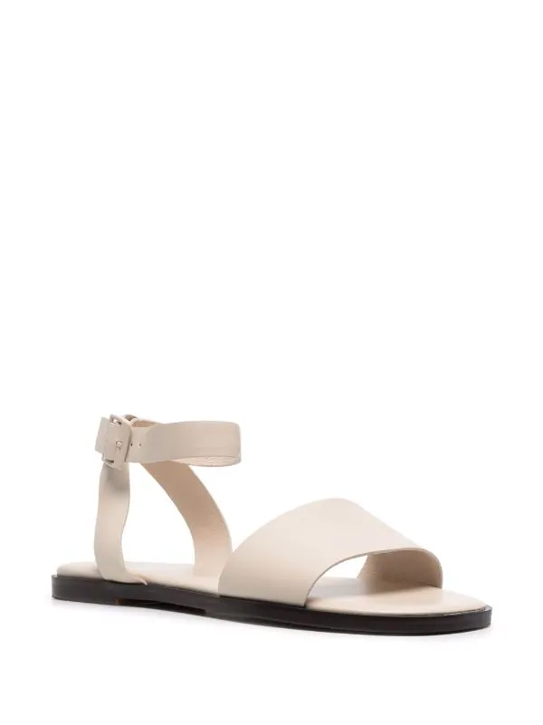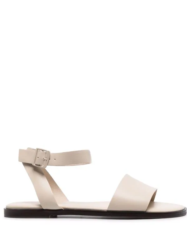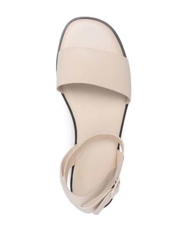 Bride cheville à boucle, bout ouvert, semelle intérieure à logo, semelle plate en caoutchouc. Matière : cuir.