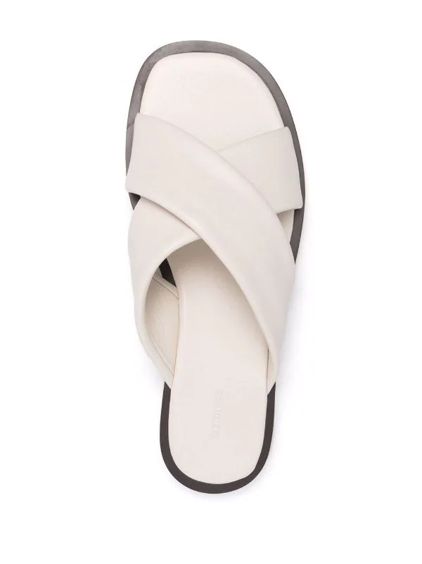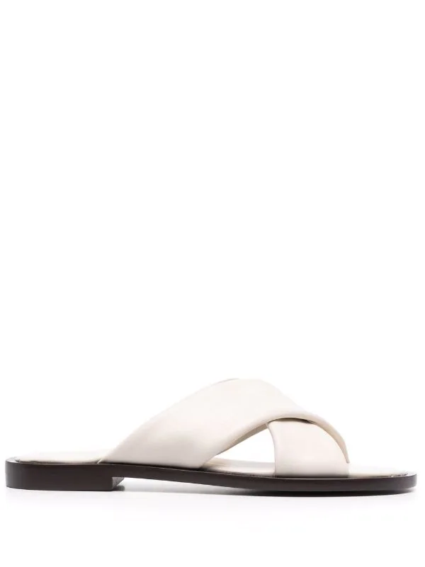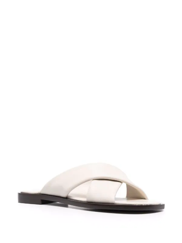 Design à enfiler, brides croisées aux orteils, bout ouvert, semelle intérieure à logo, semelle plate en caoutchouc. Matière : cuir.