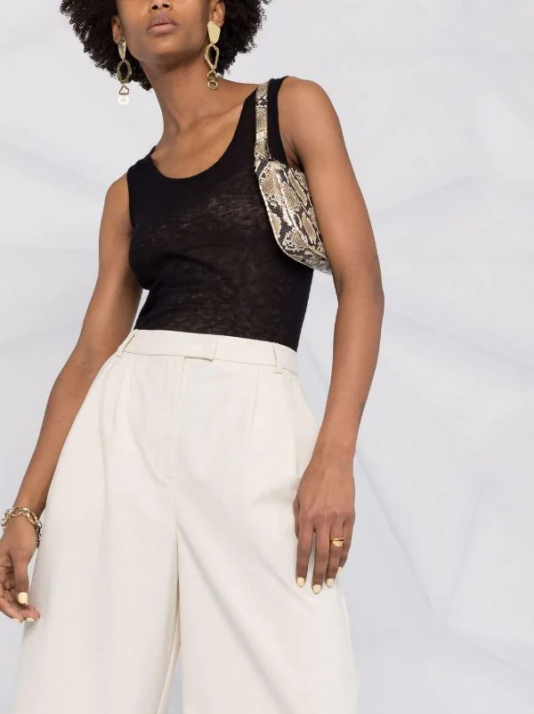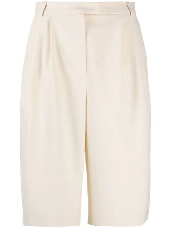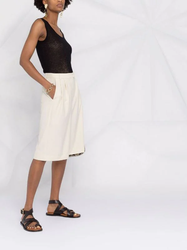 Taille mi-haute, passants de ceinture, fermeture à zip et agrafes, poches latérales fendues, poches arrière passepoilées, coupe ample, hauteur genou.