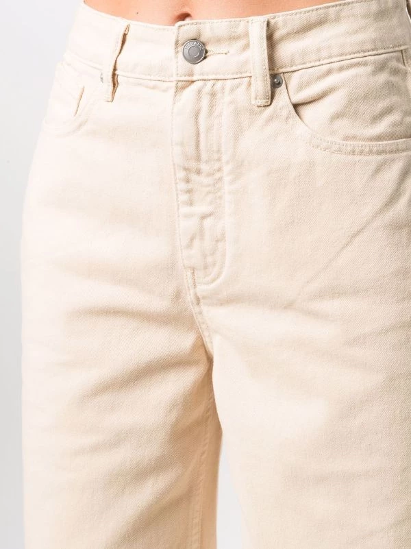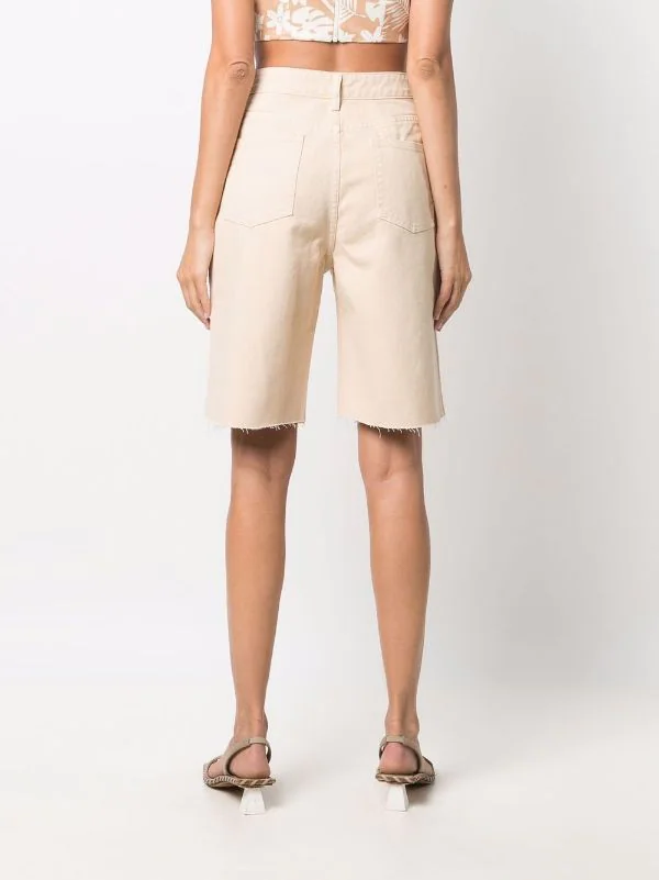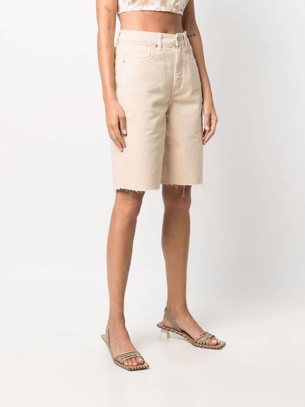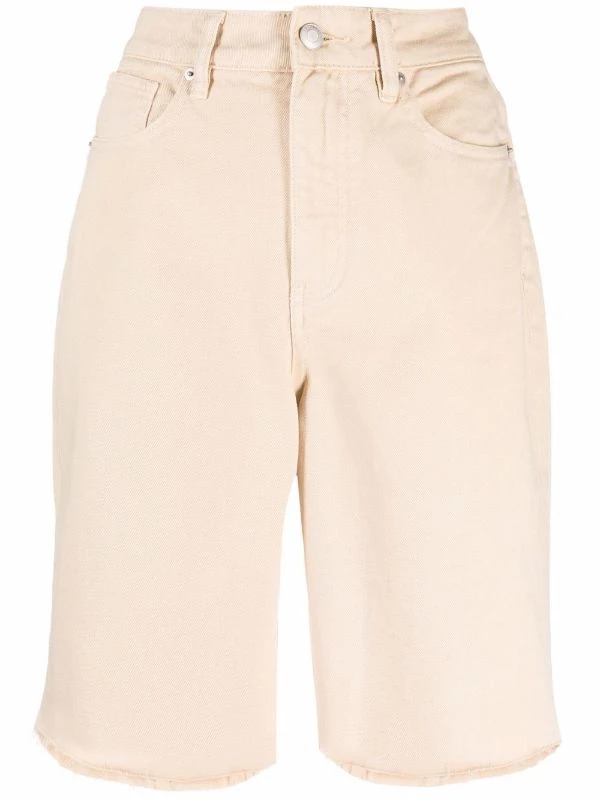 Taille haute, passants de ceinture, fermeture boutonnée, cinq poches classiques, bords francs, hauteur genou. Matière : coton.