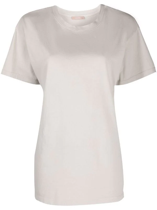 Gris clair, coton, tricot point jersey, encolure ras du cou, manches courtes, ourlet droit.