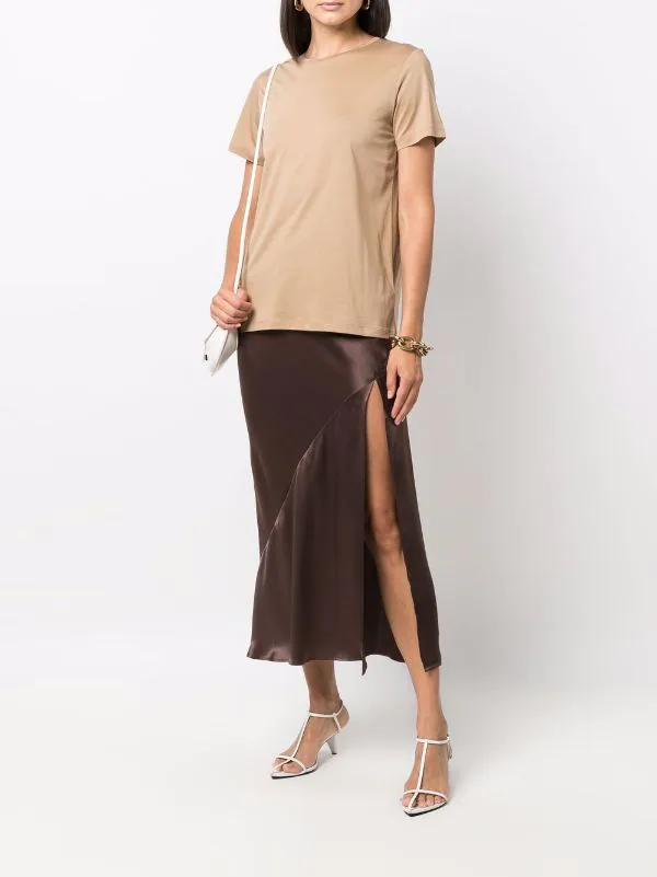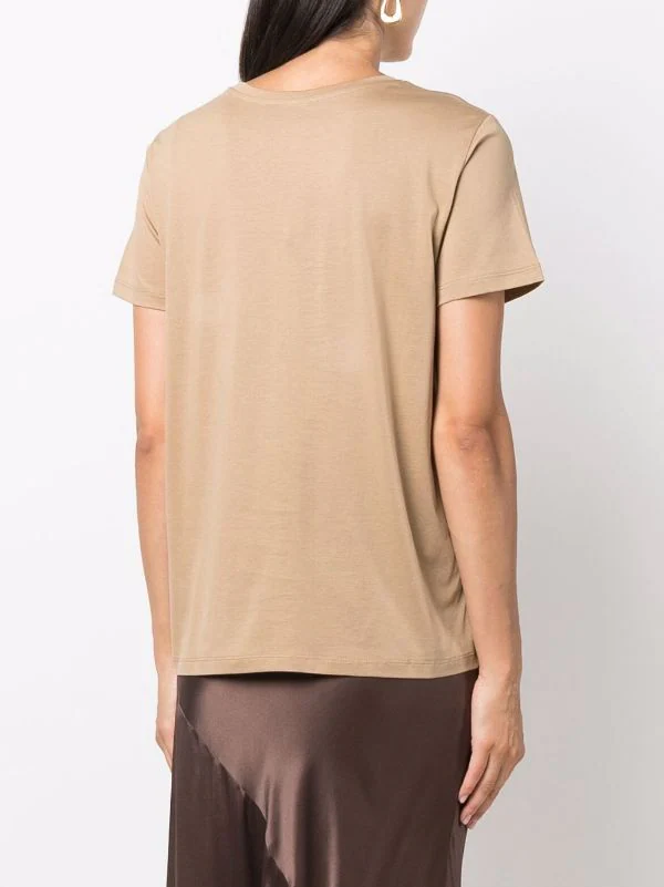 Beige, coton, encolure ras du cou, manches courtes, ourlet droit.