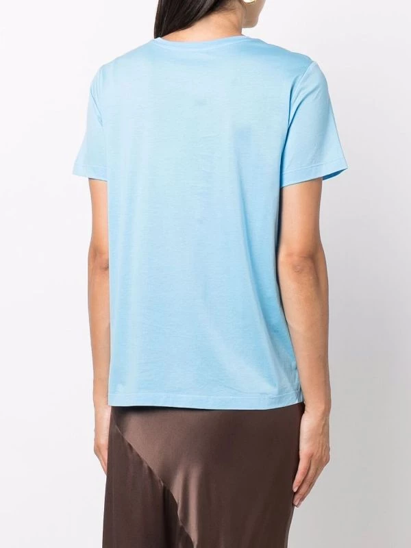 Bleu, coton, encolure ras du cou, manches courtes, ourlet droit.