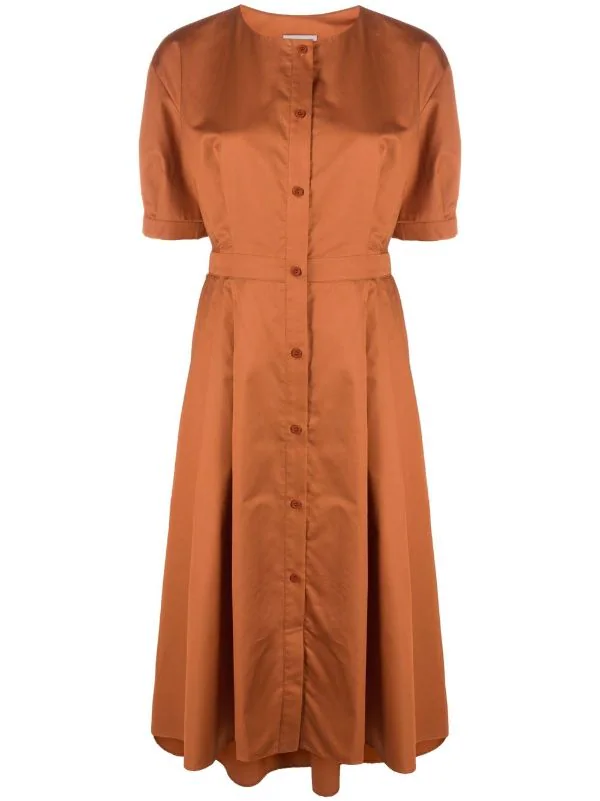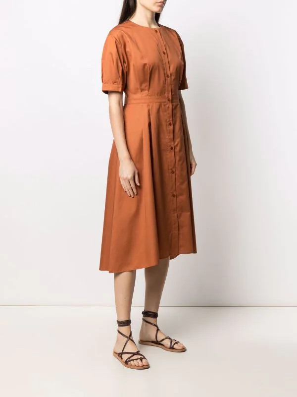 Encolure ronde, manches courtes, boutonnière sur le devant, coupe évasée, deux poches latérales fendues, détails de fronces. Couleur : orange. Matière : coton.