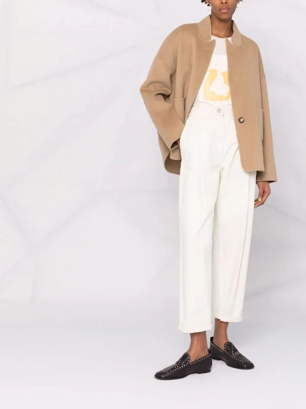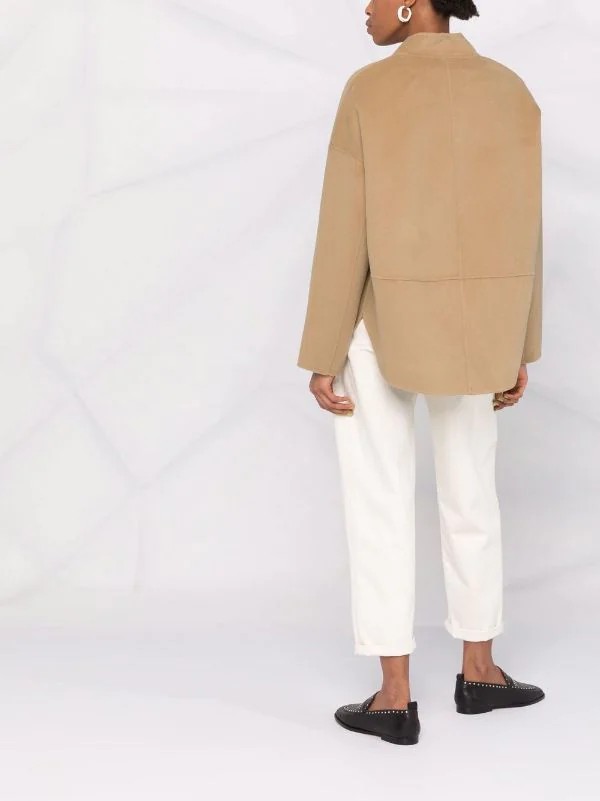 Revers pointus, effet d’épaules descendues, manches longues, boutonnière sur le devant, deux poches plaquées avant, ourlet incurvé.