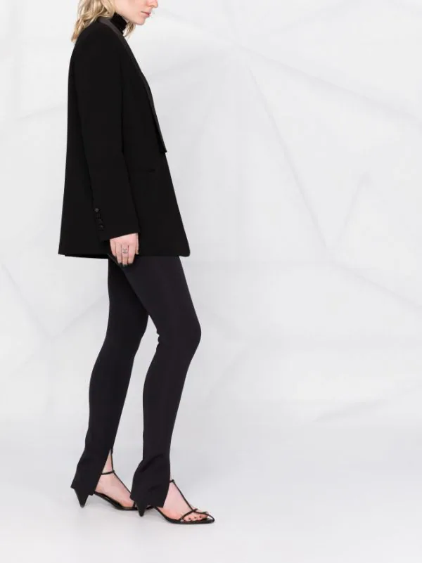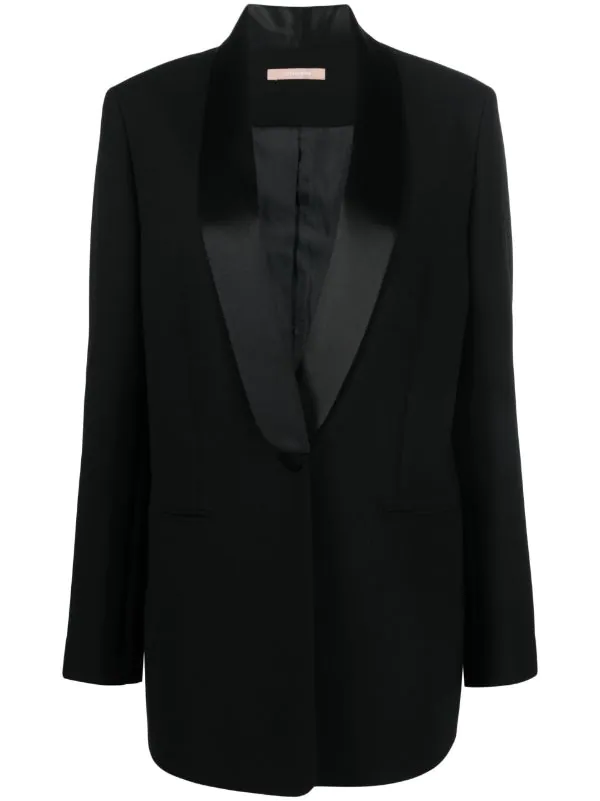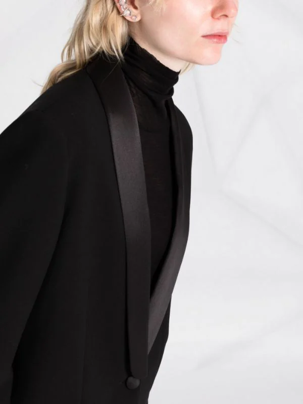 Col châle, boutonnière sur le devant, manches longues, deux poches passepoilées avant. Couleur : noir.