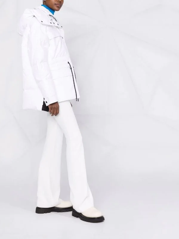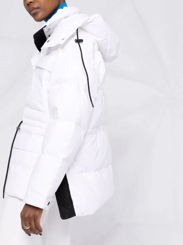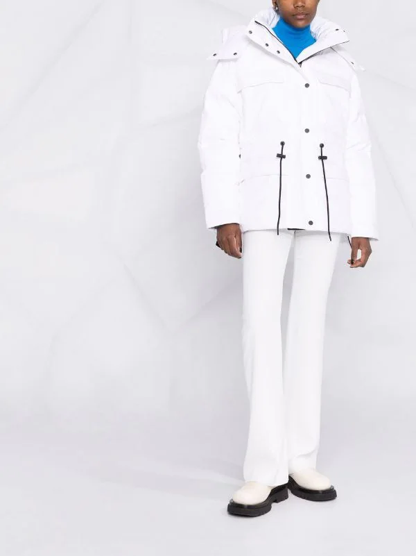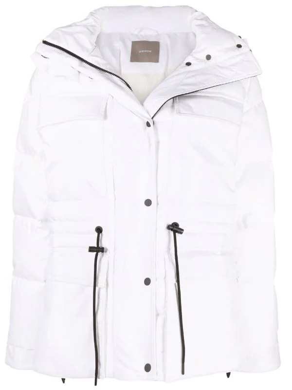 Design matelassé, design matelassé, col à boutons pression, capuche classique, deux poches poitrine à rabat, bouton pression et fermeture zippée sur le devant, fermeture zippée sur le côté, garnissage en duvet. Couleur : blanc.