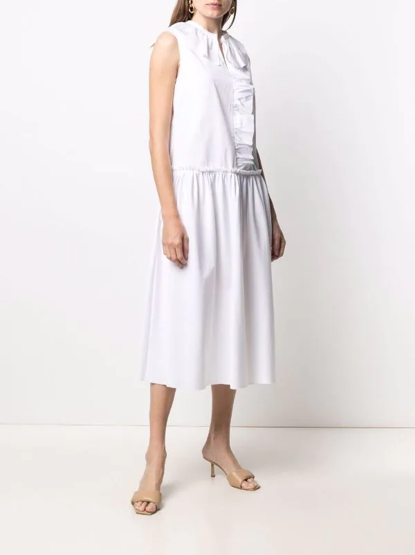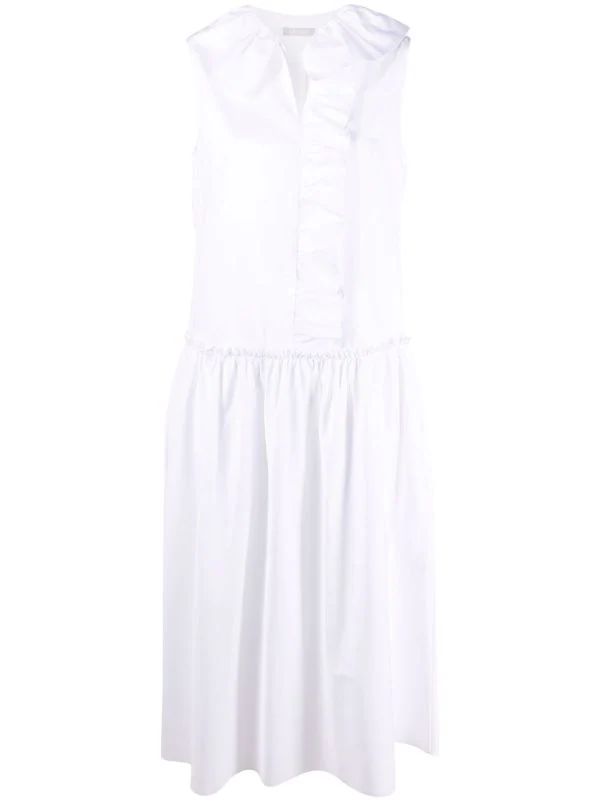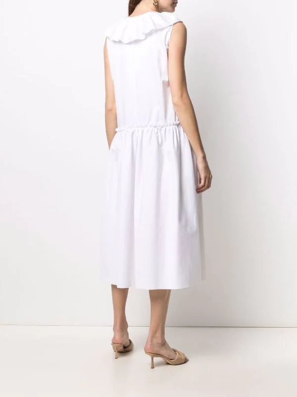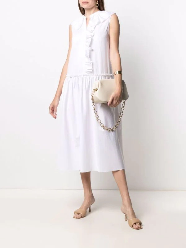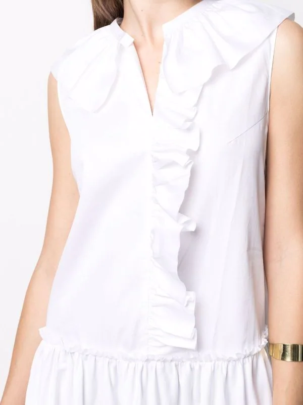 Bord volanté, col cassé, design sans manches, coupe mi-longue. Couleur : blanc. Matière : coton.