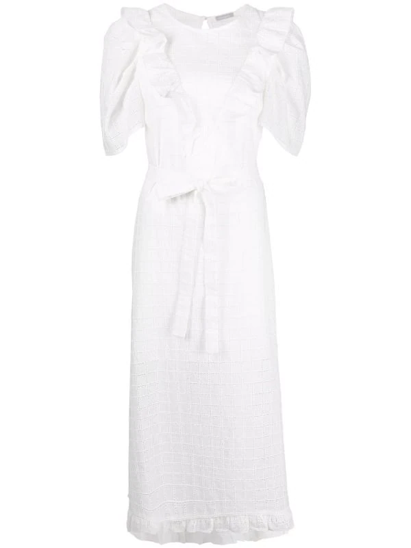 Broderie anglaise, détails de volants, taille nouée, manches bouffantes courtes, coupe longue, ourlet droit. Couleur : blanc. Matière : coton.