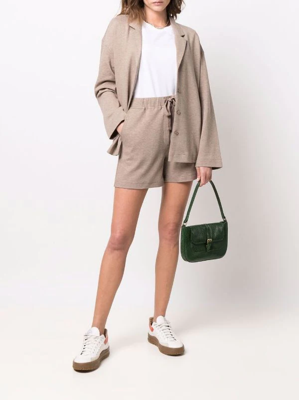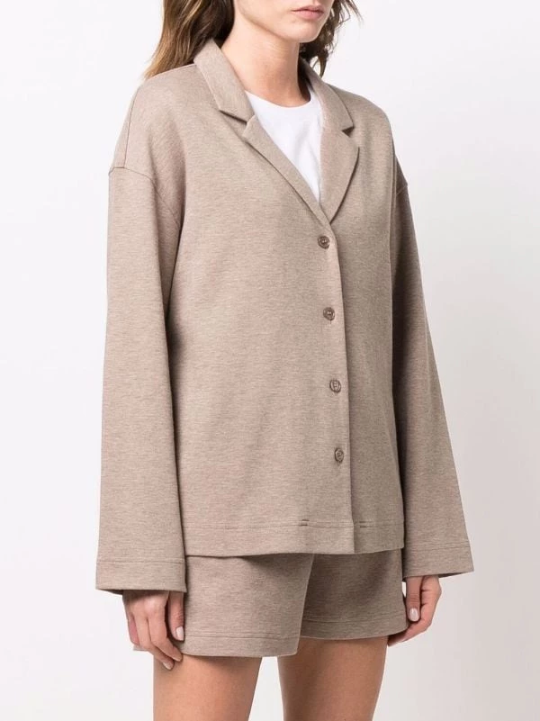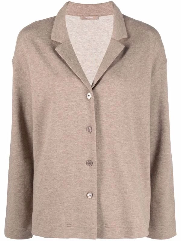 Revers crantés, manches longues, col v, boutonnière sur le devant. Matière : coton.