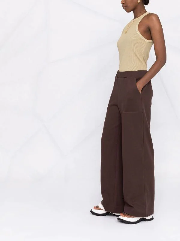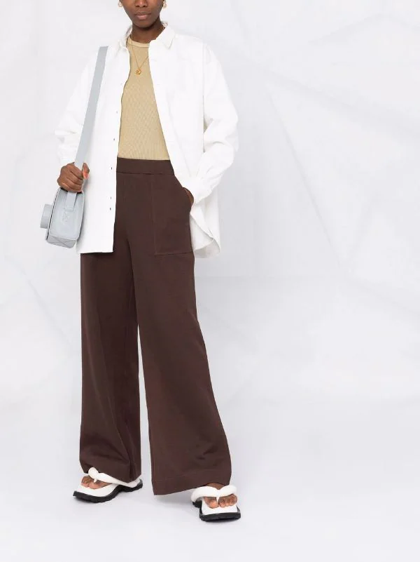 Ceinture élastique, taille haute, coupe ample, poche arrière passepoilée, deux poches plaquées avant. Couleur : marron. Matière : coton mélangé.
