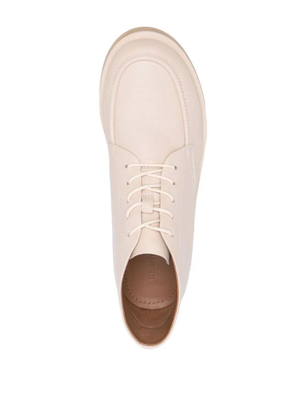 Bout rond, fermeture à lacer sur le devant, petit talon épais. Matière : cuir.
