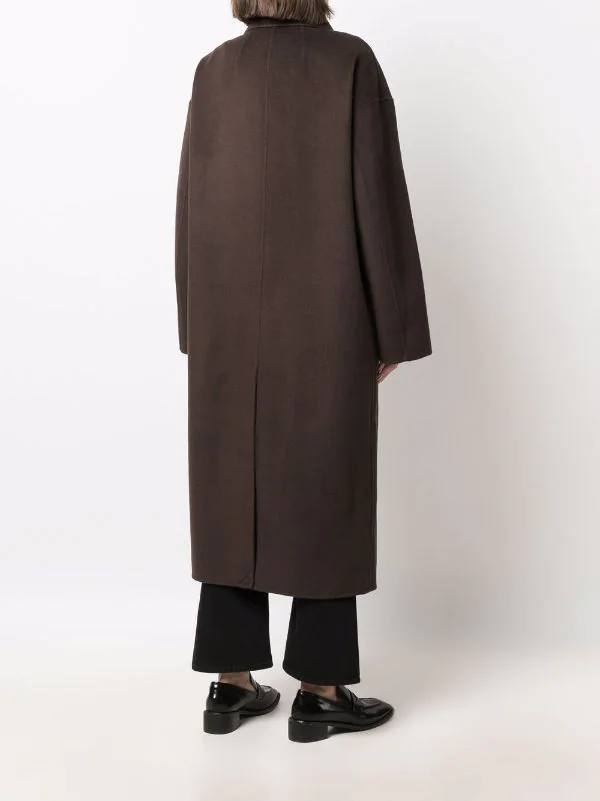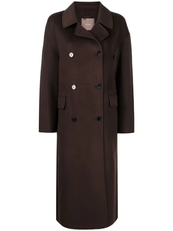 Boutonnière croisée, monture oversize, fente à l’arrière, col classique, manches longues. Couleur : marron.