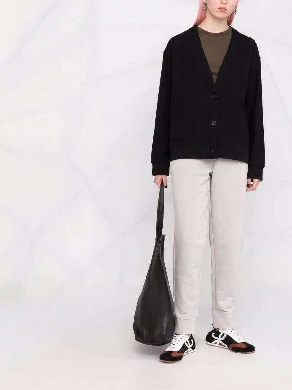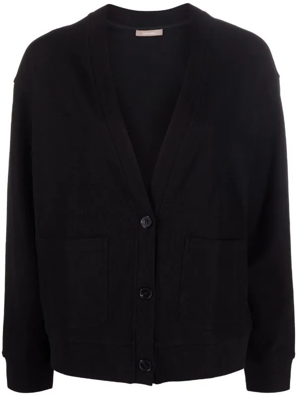 Maille fine, col v, épaules tombantes, manches longues, deux poches plaquées avant, boutonnière sur le devant. Couleur : noir. Matière : coton.