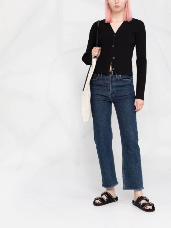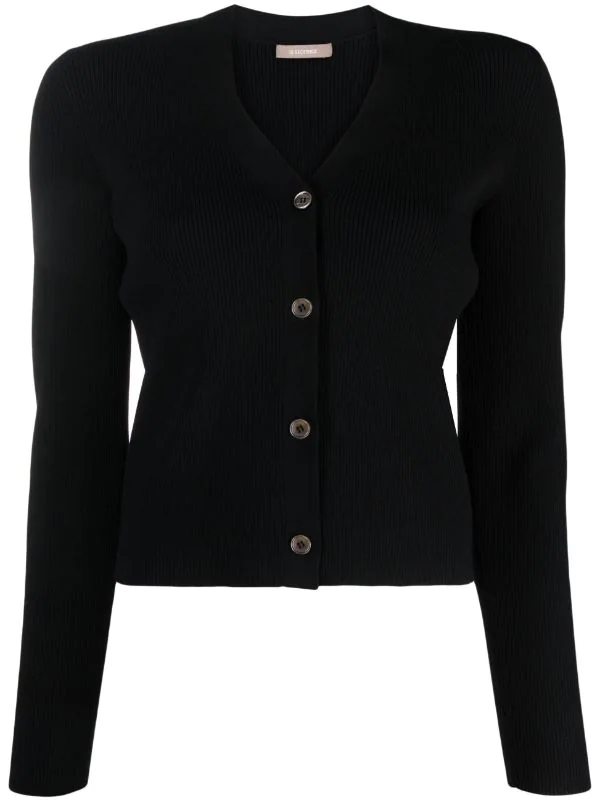 Maille nervurée, col v, boutonnière sur le devant, manches longues, ourlet droit. Couleur : noir.