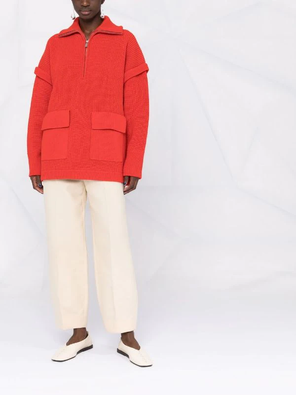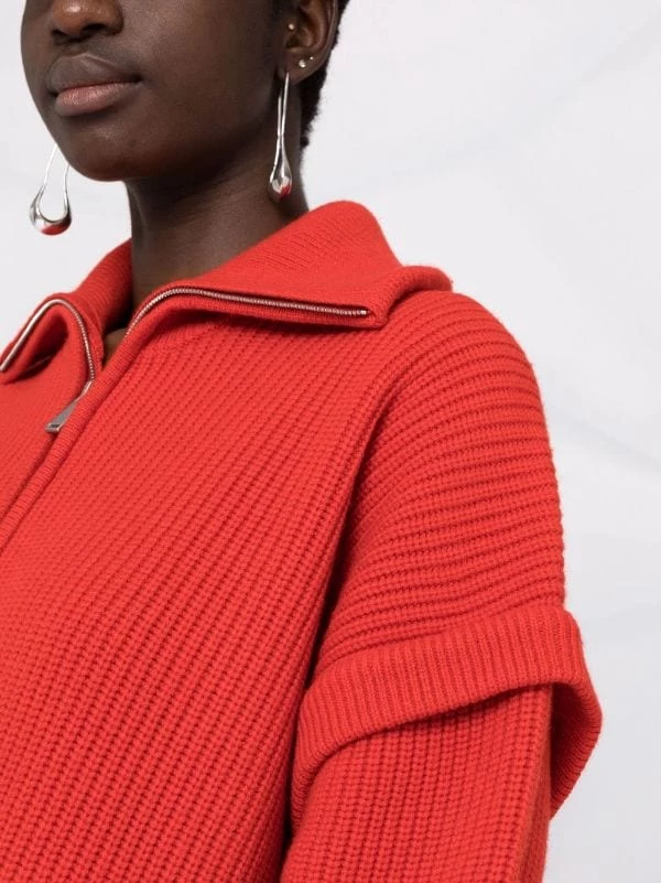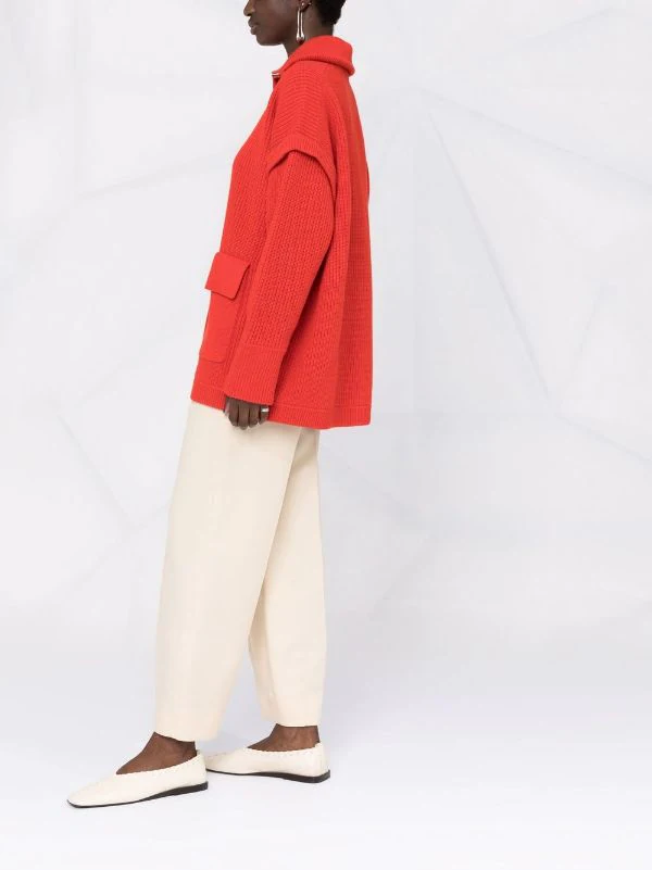 Maille nervurée, col montant, fermeture zippée sur le devant, épaules tombantes, manches longues, deux poches à rabat sur le devant. Couleur : rouge. Matière : laine mérinos.