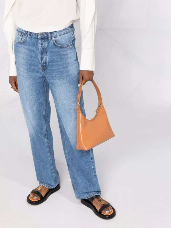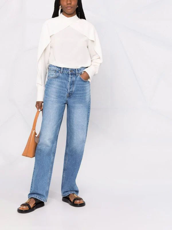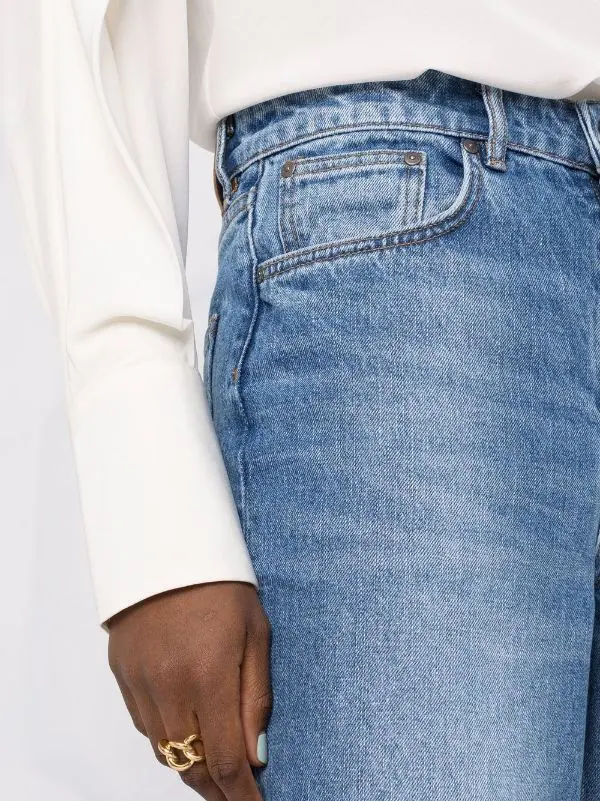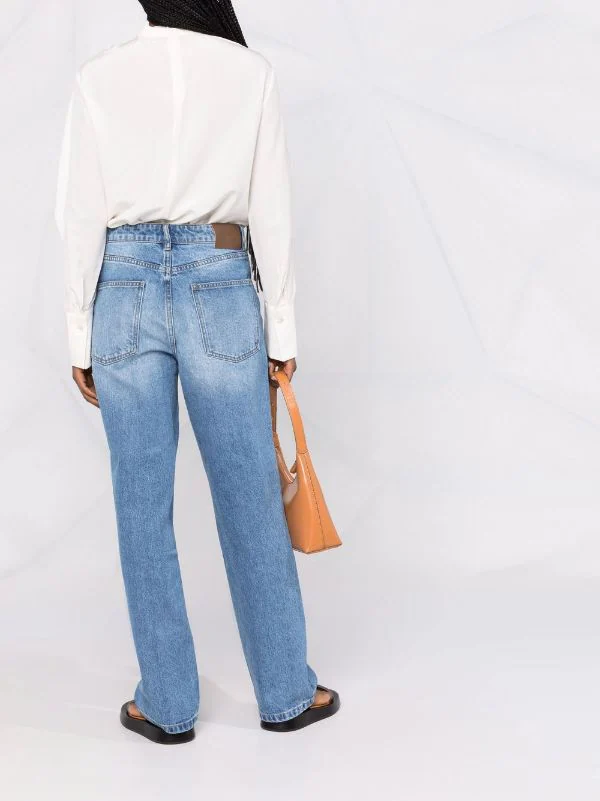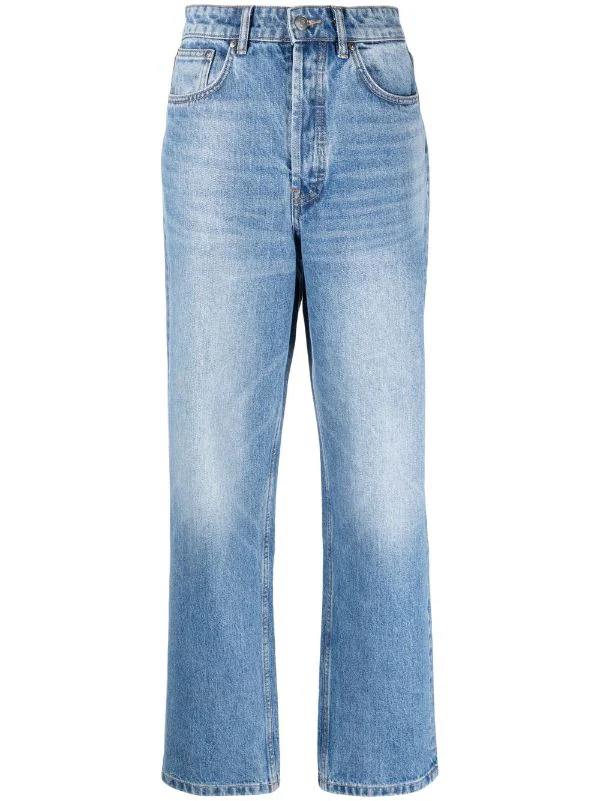 Effet délavé, patch logo sur l’arrière, taille haute, passants de ceinture, fermeture à zip et boutons sur le devant, cinq poches classiques, coupe droite. Couleur : bleu. Matière : denim de coton.
