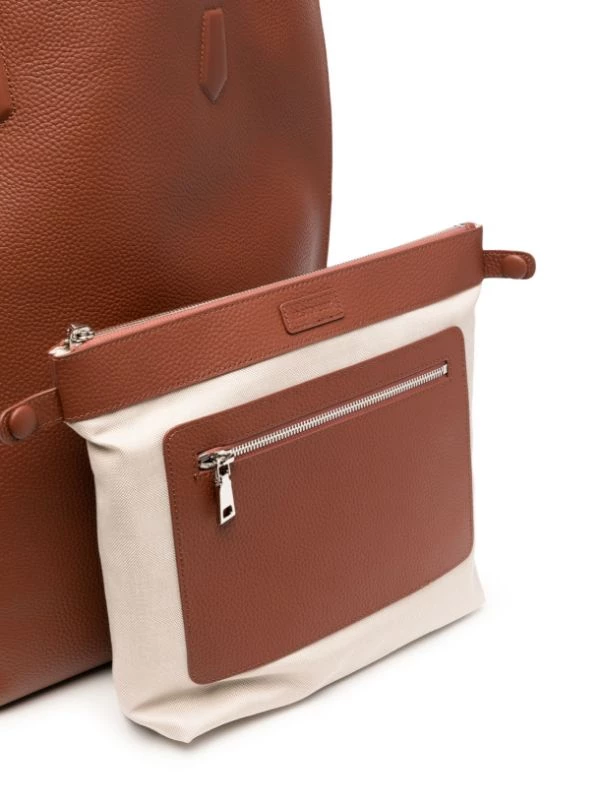 Deux longues anses sur le dessus, texture grainée, ouverture sur le dessus, sans doublure, pochette détachable. Matière : cuir.