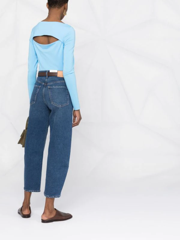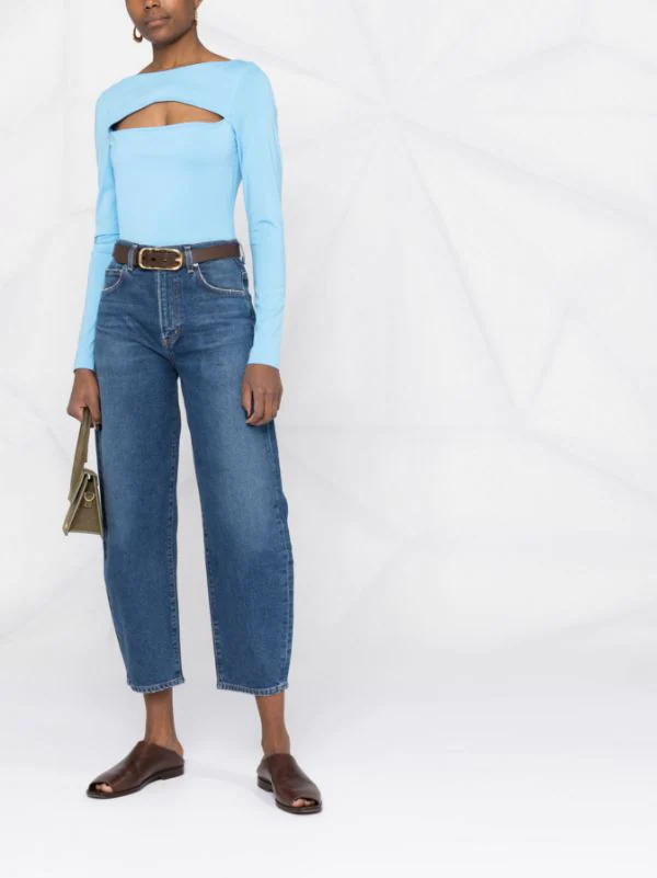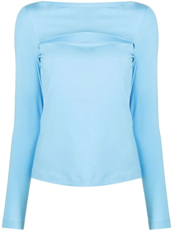 Détails de découpes, encolure bateau, manches longues, construction stretch. Couleur : bleu.