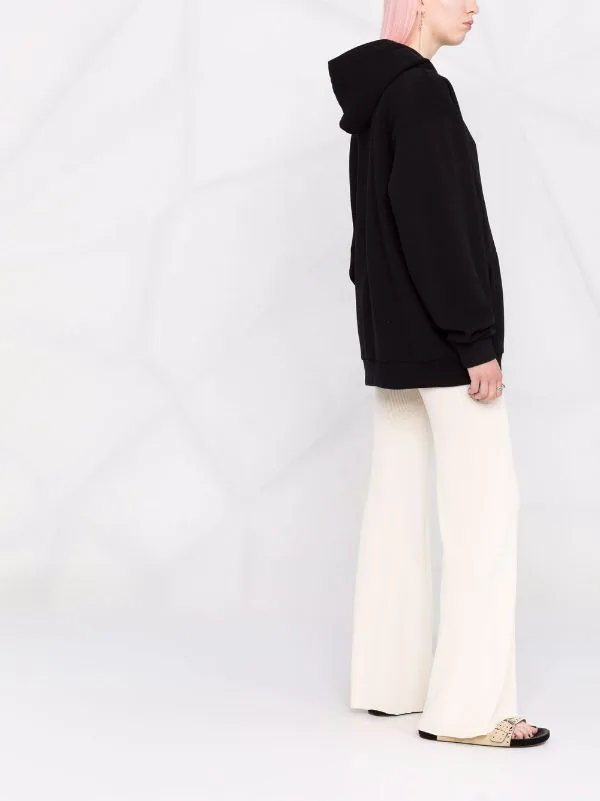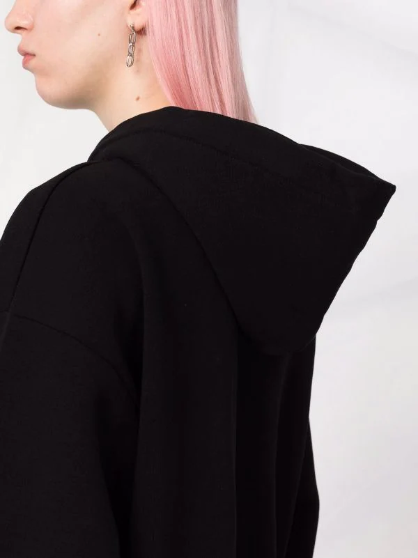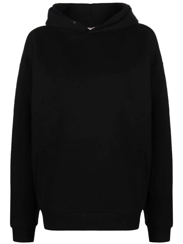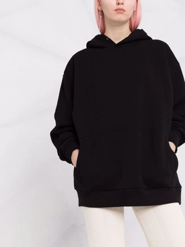 Capuche classique, épaules tombantes, manches longues, poche plaquée sur le devant, poignets nervurés, ourlet nervuré. Couleur : noir. Matière : coton mélangé.