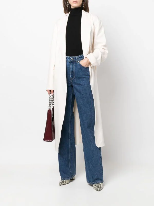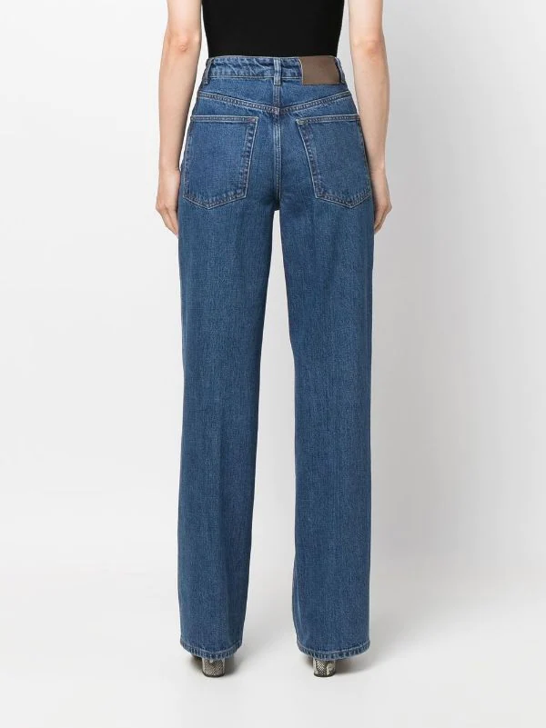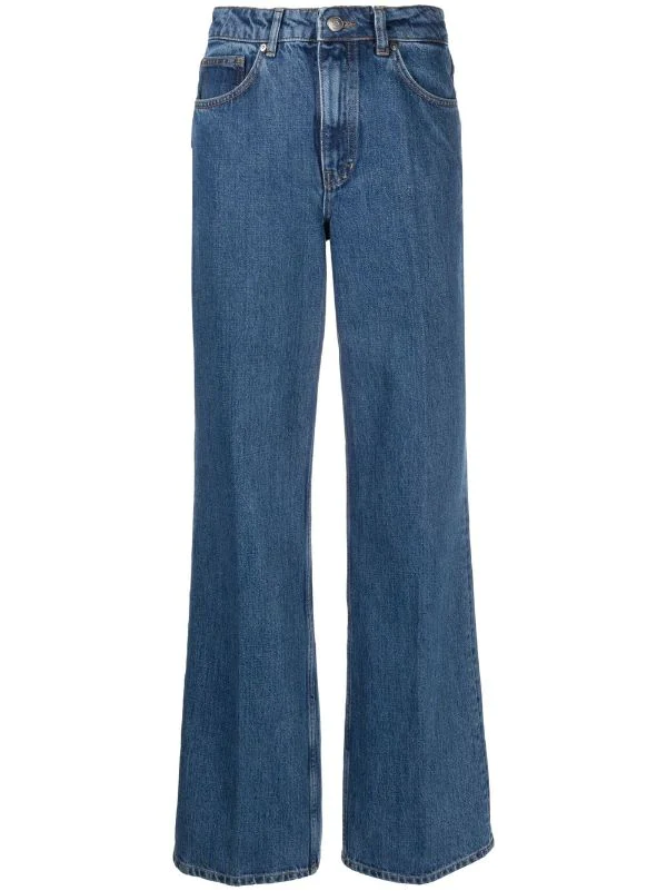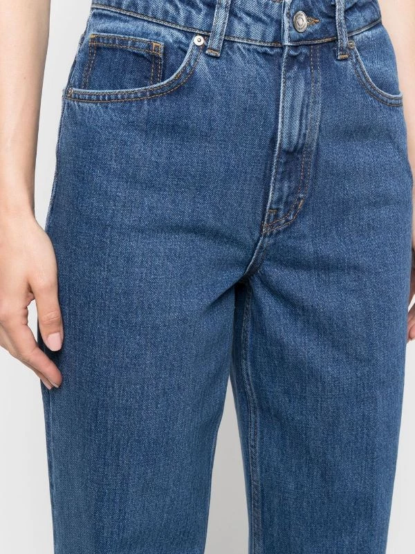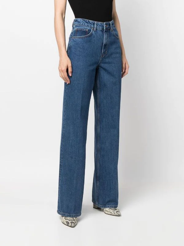 Bleu, coton biologique, taille haute, fermeture à zip et boutons sur le devant, poches latérales arrondies, patch logo sur l’arrière, poches arrière plaquées, coupe ample.